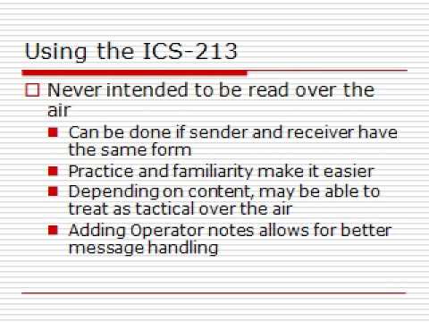The ICS 213 General Message Form is now increasingly used for messages between parties who are not in the same location. Because the nature of incident communications is generally urgent, the form is often originated in one location and transmitted electronically to another location. The reply from that location is returned electronically and the two "parts" of the form are matched together.